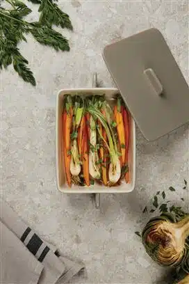 Veelzijdige gratin-/ovenschaal met deksel van steengoed – ideaal voor gratins, stoofschotels en ovengerechten. Deze schaal is oven- en vaatwasmachinebestendig, wat zorgt voor eenvoudig gebruik en schoonmaken. De bijpassende deksel houdt smaken en aroma’s perfect vast.