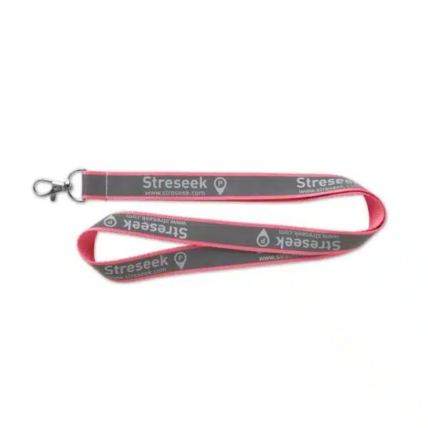 - Reflecterende stijl: Deze lanyard is gemaakt van polyester met een grijze reflecterende laag, waardoor je logo opvalt, zelfs bij weinig licht. Met een metalen karabijnhaak en verschillende clipopties, kun je jouw lanyard aanpassen zoals jij dat wilt. Leverbaar in elke Pantone-kleur