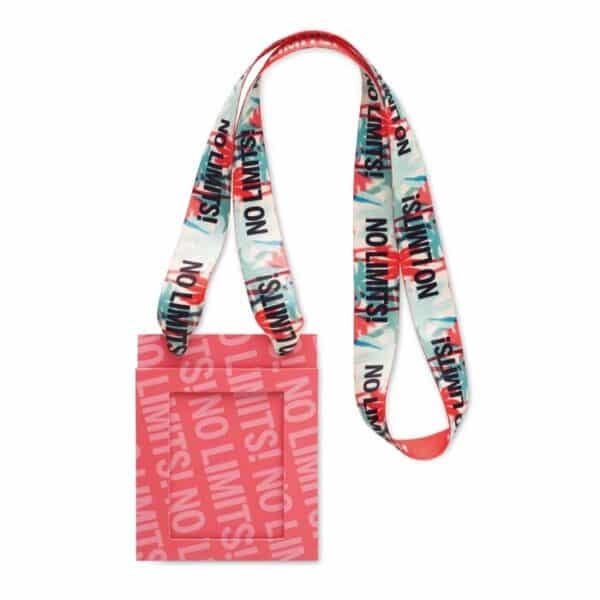Deze gesublimeerde lanyard met badgehouder in eigen huisstijl is vervaardigd van fijn polyester en heeft een innovatief ontwerp zonder de gebruikelijke metalen haken. De badge wordt stevig vastgehouden door de inkepingen aan het uiteinde van het lint. Gepatenteerd systeem.