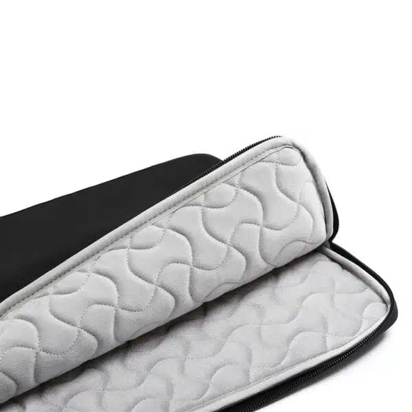 De premium design 16″ laptophoes in klassiek zwart biedt optimale bescherming voor je laptop. Deze hoes is zorgvuldig vervaardigd uit 1200D rPET-materiaal met een waterafstotende afwerking en een zachte grijze fleecevoering, waardoor je apparaat goed beschermd is tegen dagelijkse slijtage. De waterdichte rits biedt extra bescherming tegen vocht en andere elementen. Bovendien zijn de gerecyclede stoffen en milieu-impactclaims gevalideerd door de AWARE™ fysieke tracer en blockchain-technologie. Afmetingen: 27 x 2,5 x 38,5 cm.