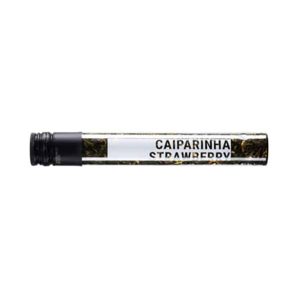 Een rPET-tube van 56 gram, gevuld met verse caipirinha strawberry thee.