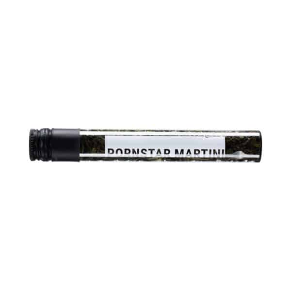 Een rPET-tube van 56 gram, gevuld met verse Pornstar Martini thee.