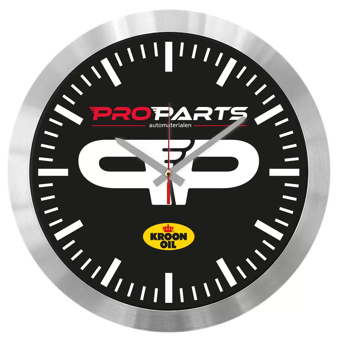 Onze Falcon wandklok heeft een geborstelde aluminium rand en een echte glazen voorzijde, wat zorgt voor een luxe en professionele uitstraling. De wijzerplaat wordt volledig op maat bedrukt met jouw logo, tekst of visual – het aantal drukkleuren maakt niet uit, ook full colour ontwerpen zijn mogelijk.