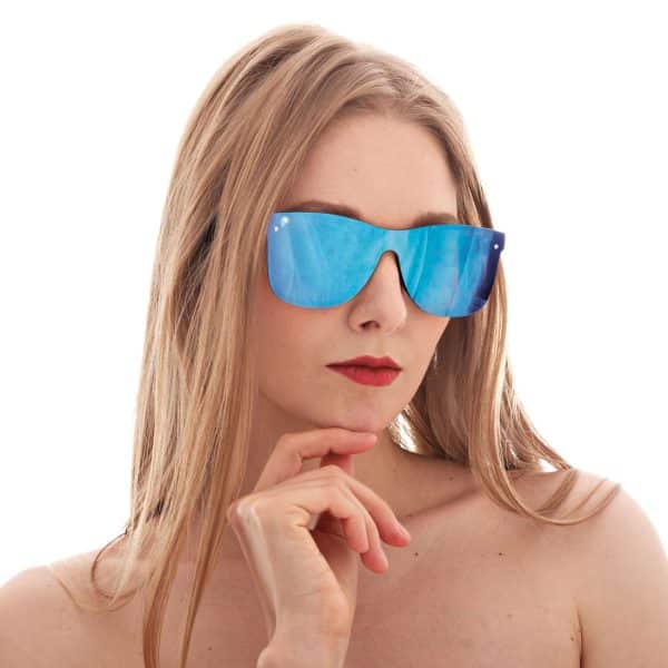 Markante, opvallende zonnebril met één grote lens. Deze bril leent zich perfect in combinatie met een grote spiegelens in een kleur of een zwarte lens in categorie 3.